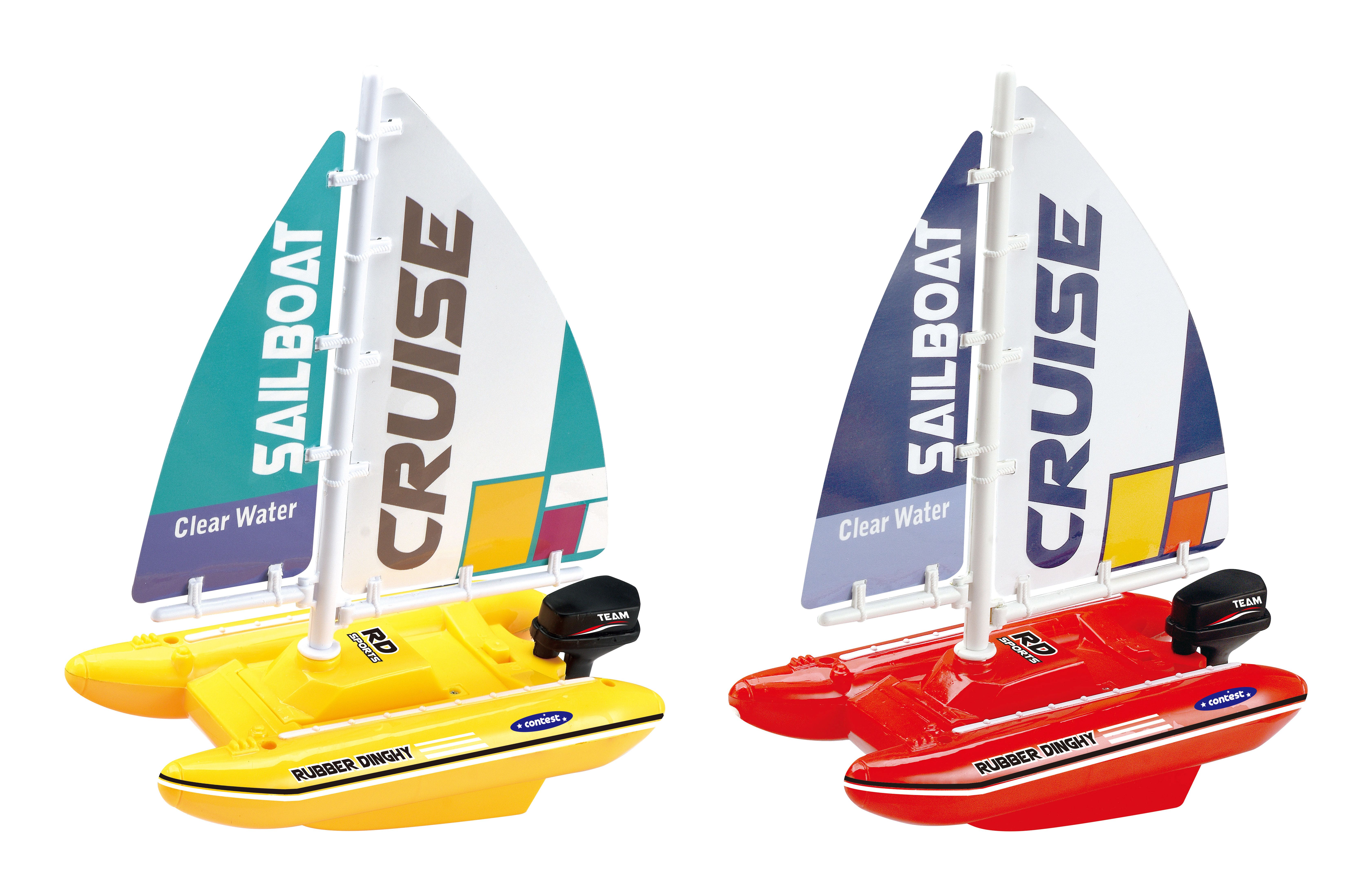 Loď katamarán. Rozměry 19x9,5x25 cm. 2xAA baterie nejsou součástí. Přepínač ON/OFF v zadní části lodi před motorem. 2 barevné varianty - žlutá, červená.