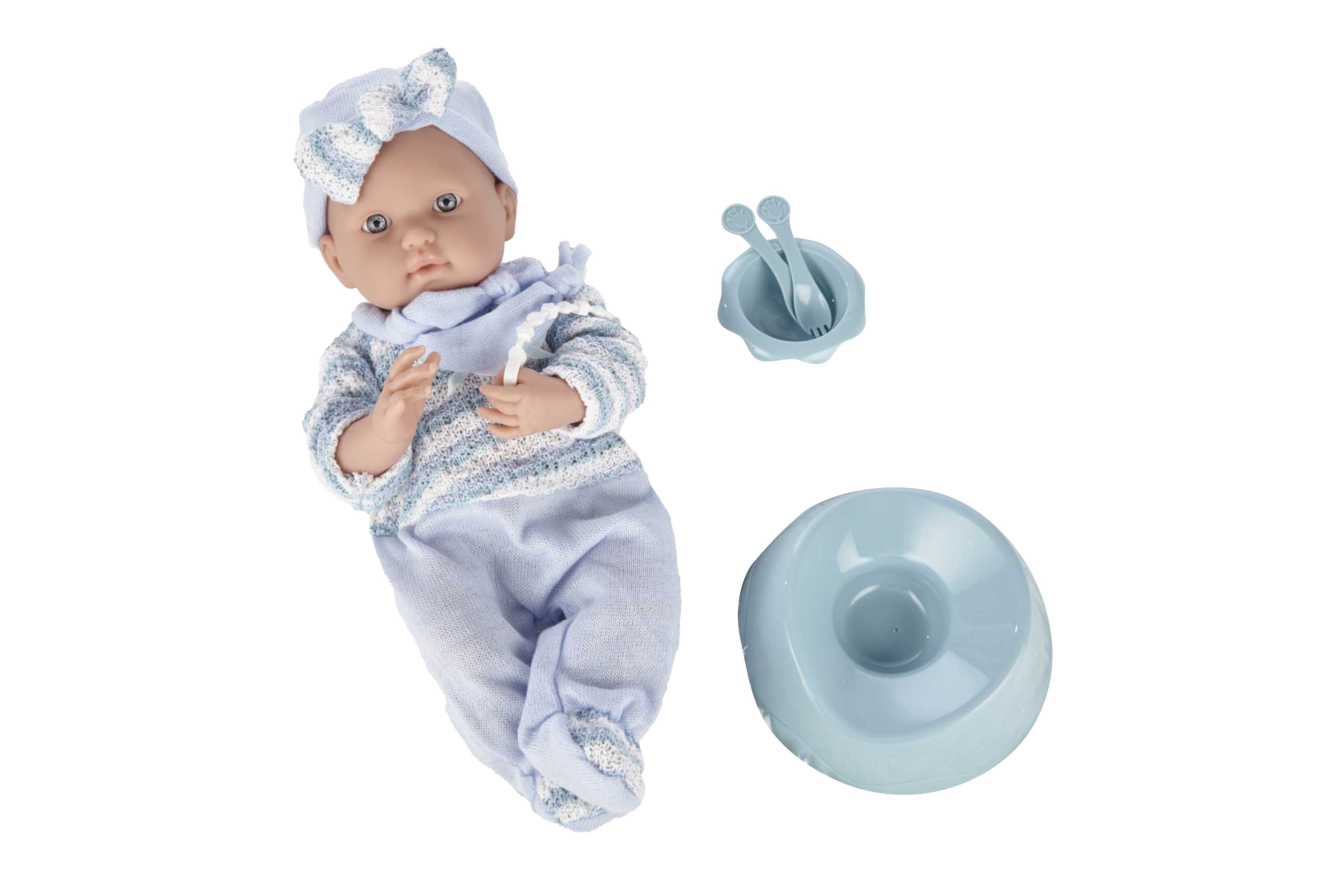 Miminko v overalu modré. Velikost 40 cm. Obsahuje: miminko, nočník, miska, příbor, dudlík.
