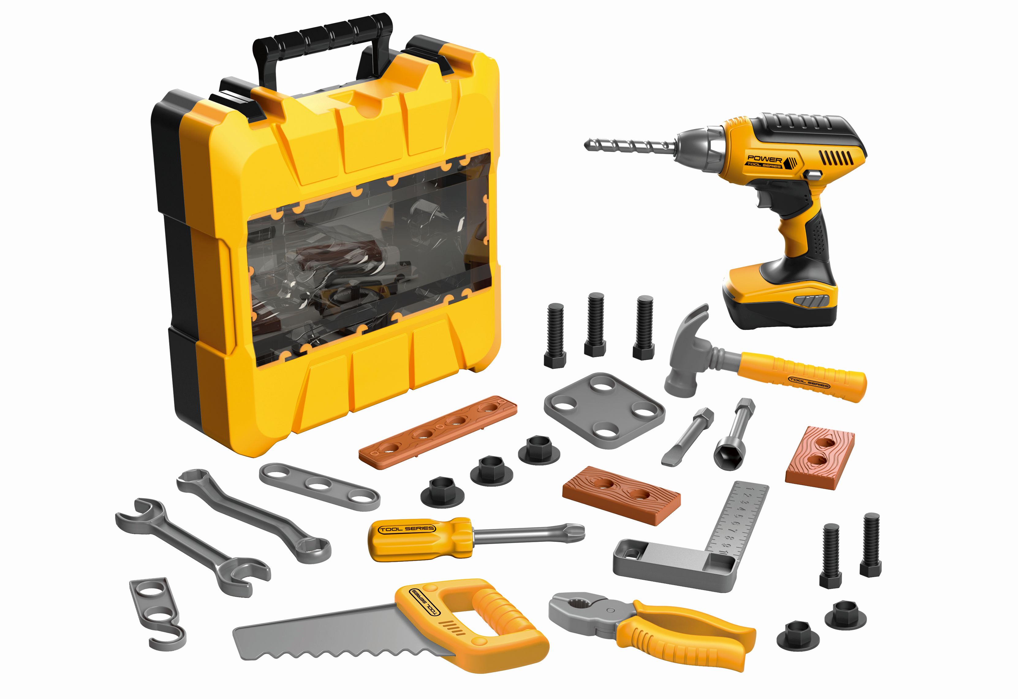 Nářadí v kufříku. Rozměry kufříku 26x9x25,5 cm. Světelné efekty. 3xAAA baterie do vrtačky nejsou součástí. Přepínač ON/OFF na vrtačce. Součástí kufřík, vrtačka s náhradními šroubováky, kladivo, kombinačky, pilka, šroubovák, 2 klíče, pravítko, dřívka, šrouby, matice a další.