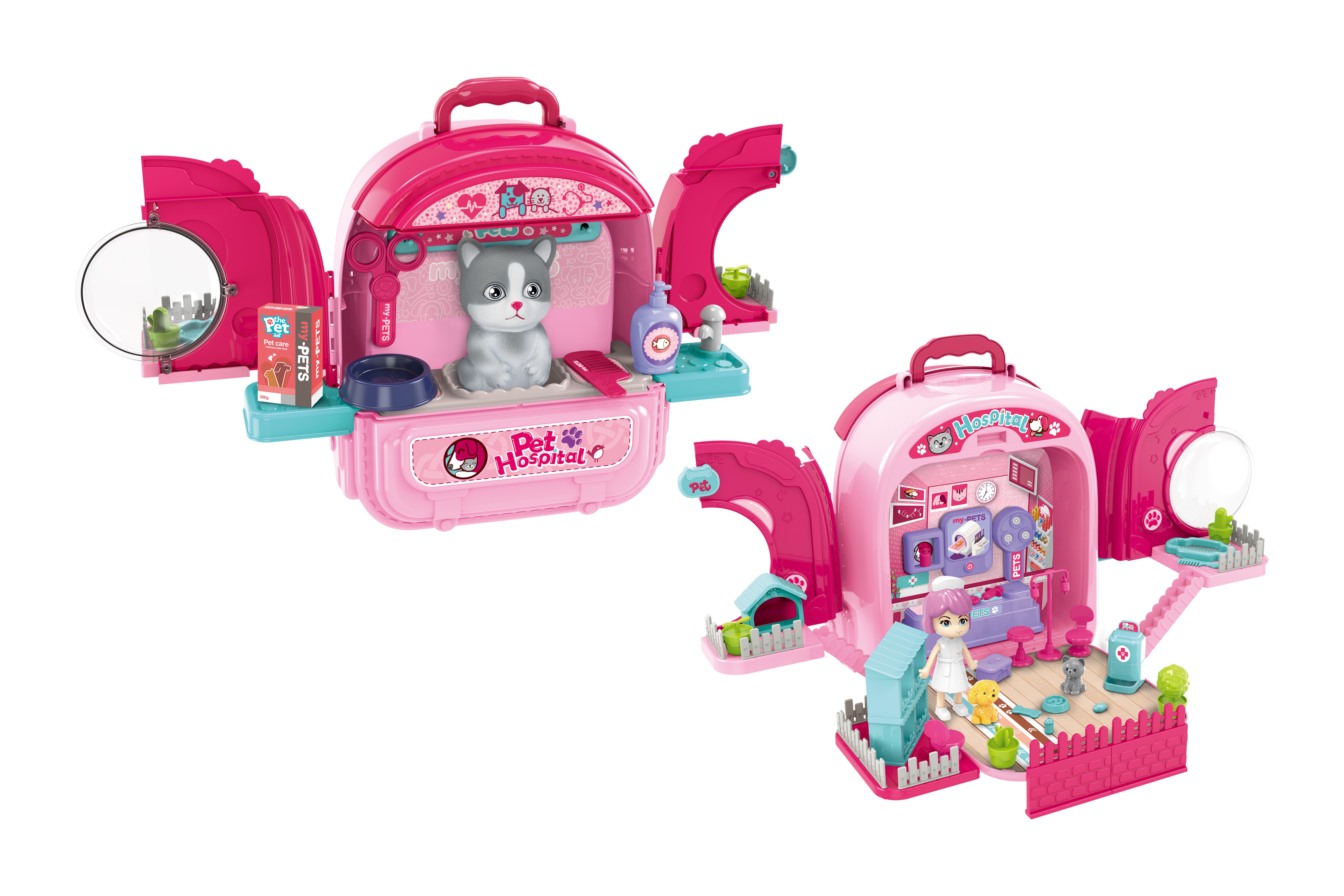 Nemocnice zvířecí v batohu kočka. Rozměry 50x35x30 cm. Velikost kočky 17 cm. Batoh je otevírací ze dvou stran. Balení obsahuje zařízení zvířecí ordinace, figurku kočky a příslušenství: misku, lahvičky, panenku zdravotní sestru, drobnosti do ordinace.