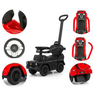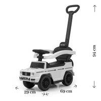 Dětské odrážedlo s vodící tyčí MERCEDES G350d je vyrobeno v licenci koncernu MERCEDES. Váš malý závodník či závodnice se v něm bude cítit jako v opravdovém džípu. Odrážedlo je vyrobeno s důrazem na každý detail a kvalitu použitých materiálů. Jeho vzhled upoutá pozornost nejen každého dítěte, ale i rodiče. Odrážedlo pomáhá rozvíjet motorické schopnosti dítěte a Váš malý závodník či závodnice si s ním užije spoustu zábavy a legrace. Autíčko má na tříramenném volantu tlačítka vydávající různé melodie, zvuk motoru nebo houkačku. Je určeno jak pro nejmenší děti, které už umí sedět, tak i pro děti, které se už naučily chodit. Odrážedlo má otočná přední kola, široké a komfortní sedadlo s úložným prostorem a pohodlnou a zároveň pevnou vodící tyč, kterou lze odrážedlo řídit. Vodící tyč, opěrky na ruce a podnožky lze sundat a tím dítě využije autíčko jako klasické odrážedlo. Baterie nejsou součástí balení (2x AA 1.5V).