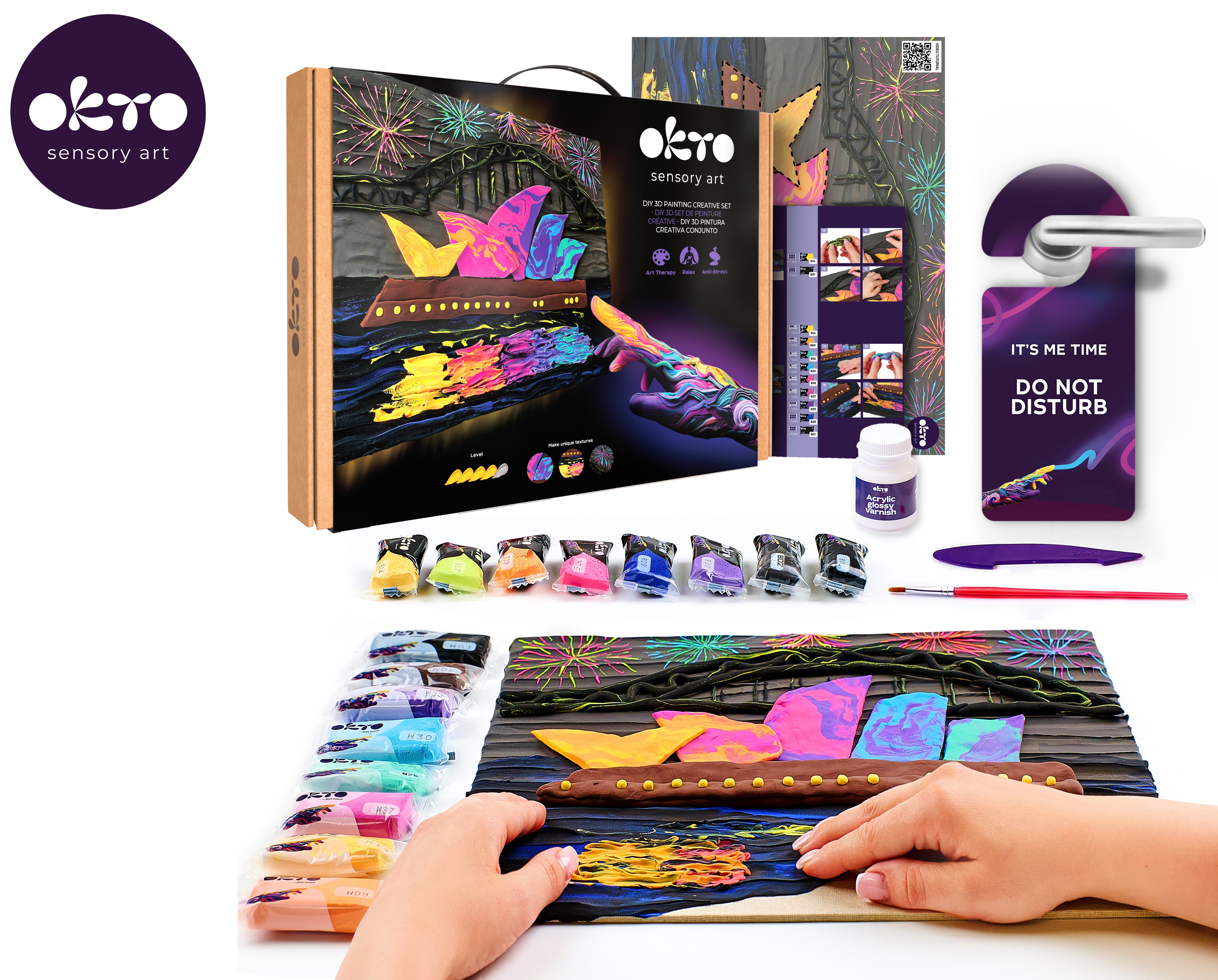 OKTO Malování hmotou motiv "#Opera House - Sydney". Velikost plátna 30x40 cm. Obtížnost 4/5. Obsah balení - přírodní plátno, obrázkový návod, modelovací nástroj, sada samoschnoucí modelovací hmoty, akrylový lak 20 ml, štětec.
