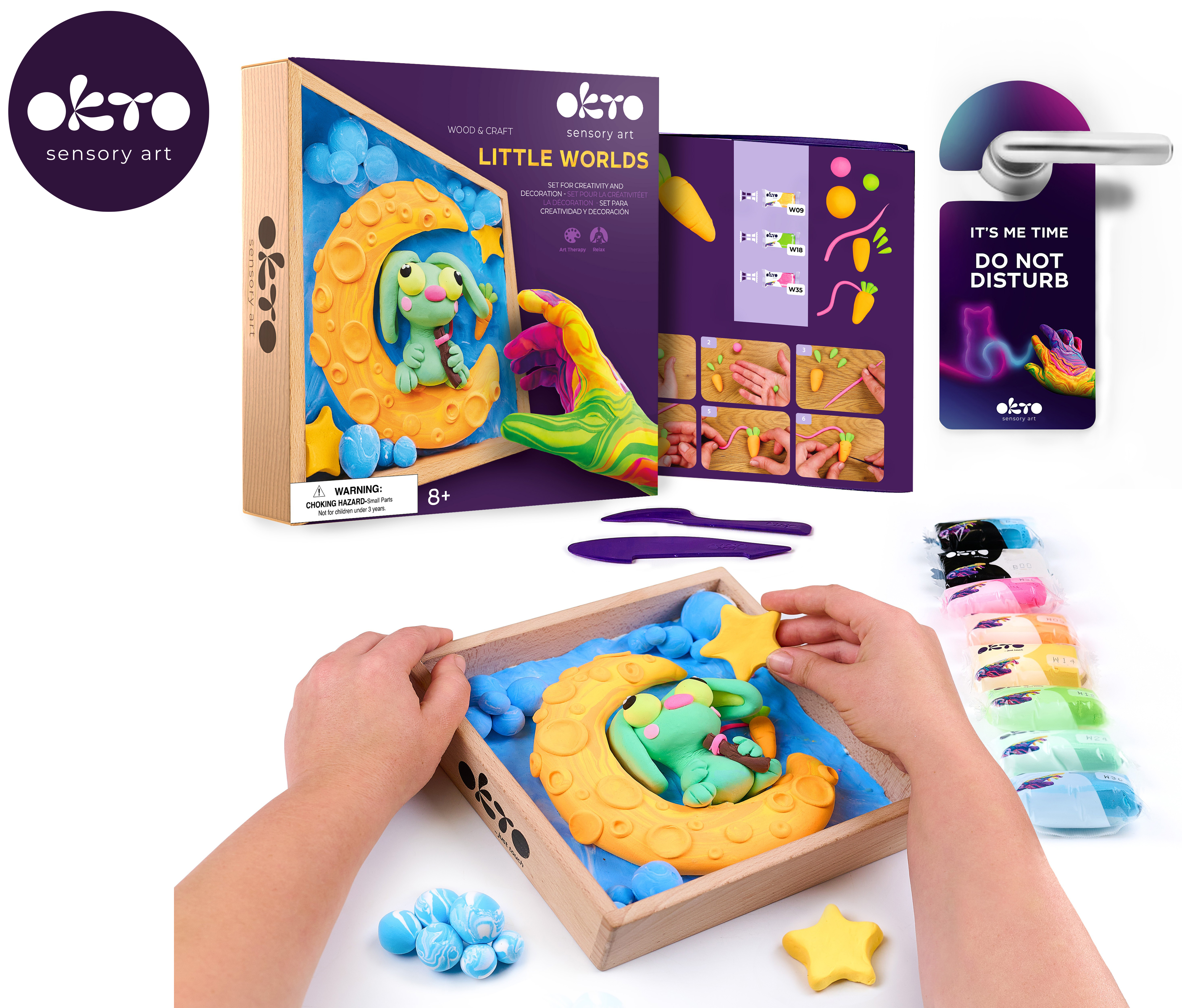 OKTO Modelování Malý svět v rámečku motiv "Zajíček na měsíci". Velikost rámu 21x21 cm. Vytvarujte 3D scénu podle návodu. Obsah balení - dřevěný rám, obrázkový návod, dřevěný modelovací nástroj, sada samoschnoucí modelovací hmoty, akrylový lak 20 ml, štětec.