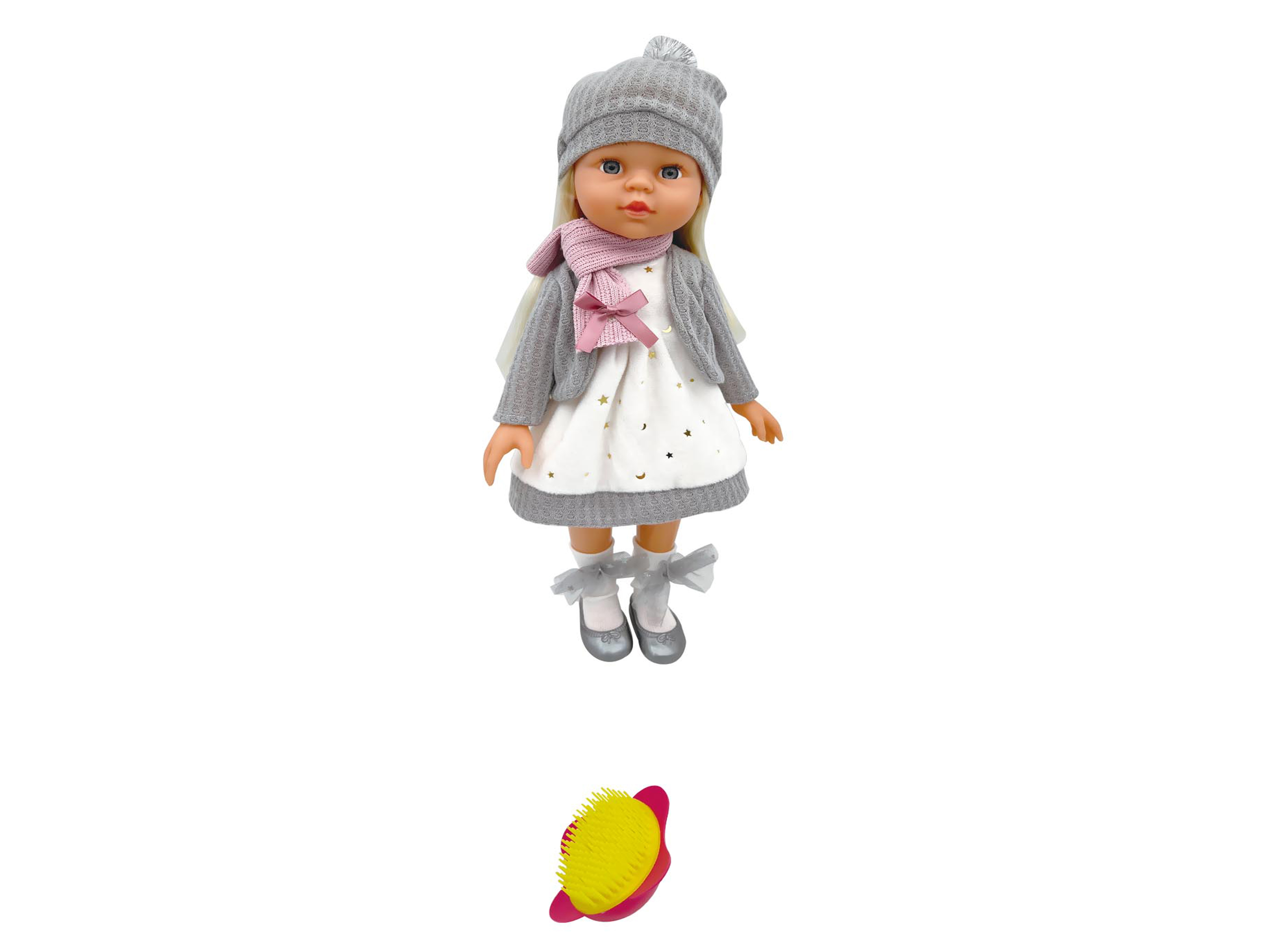 Panenka s hřebenem. Velikost 43cm. Obsahuje panenku a hřeben na vlasy.