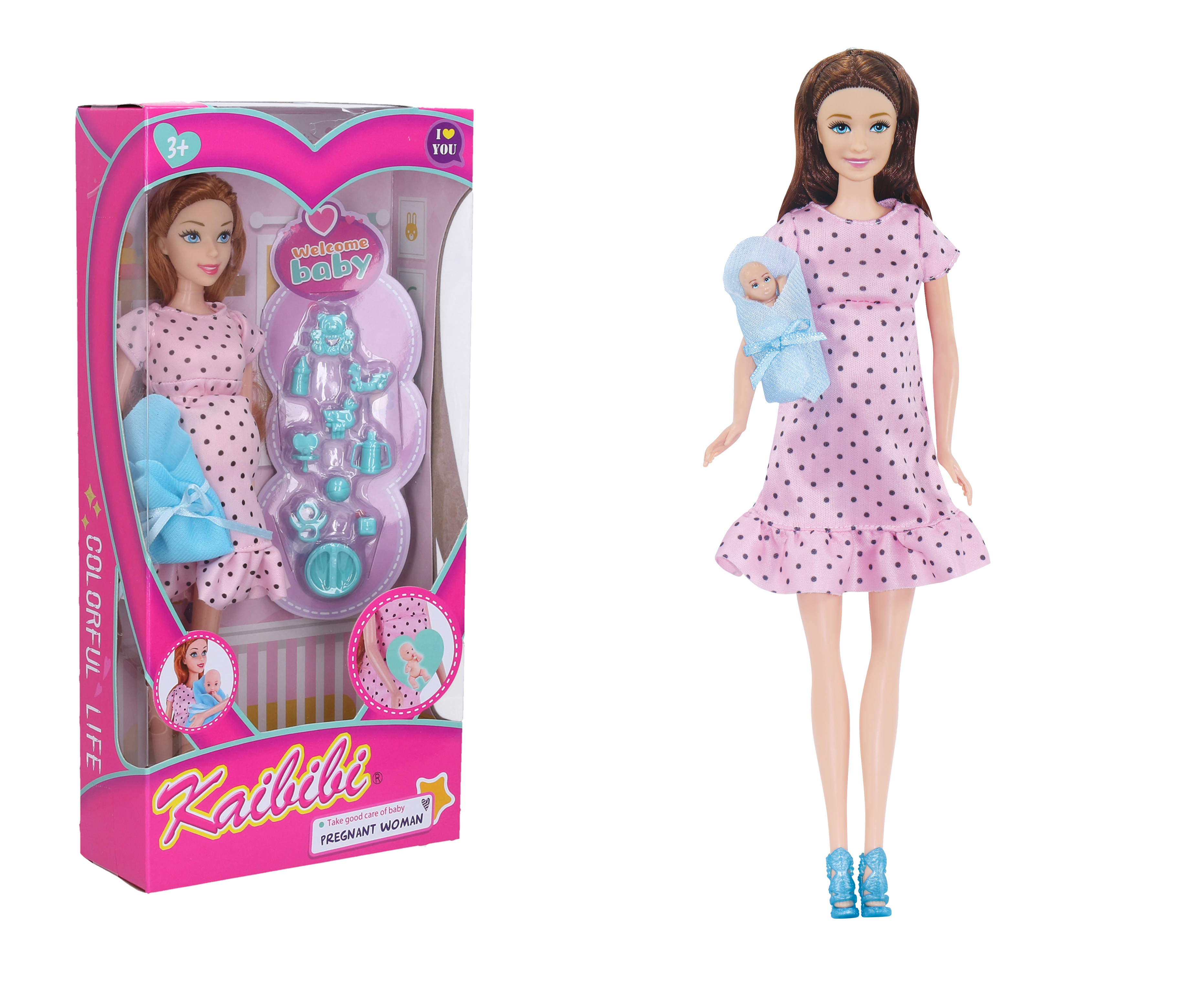 Panenka těhotná s příslušenstvím set. Velikost 29 cm. Obsah balení - panenka, příslušenství, miminko.