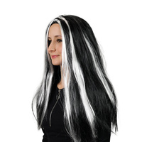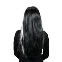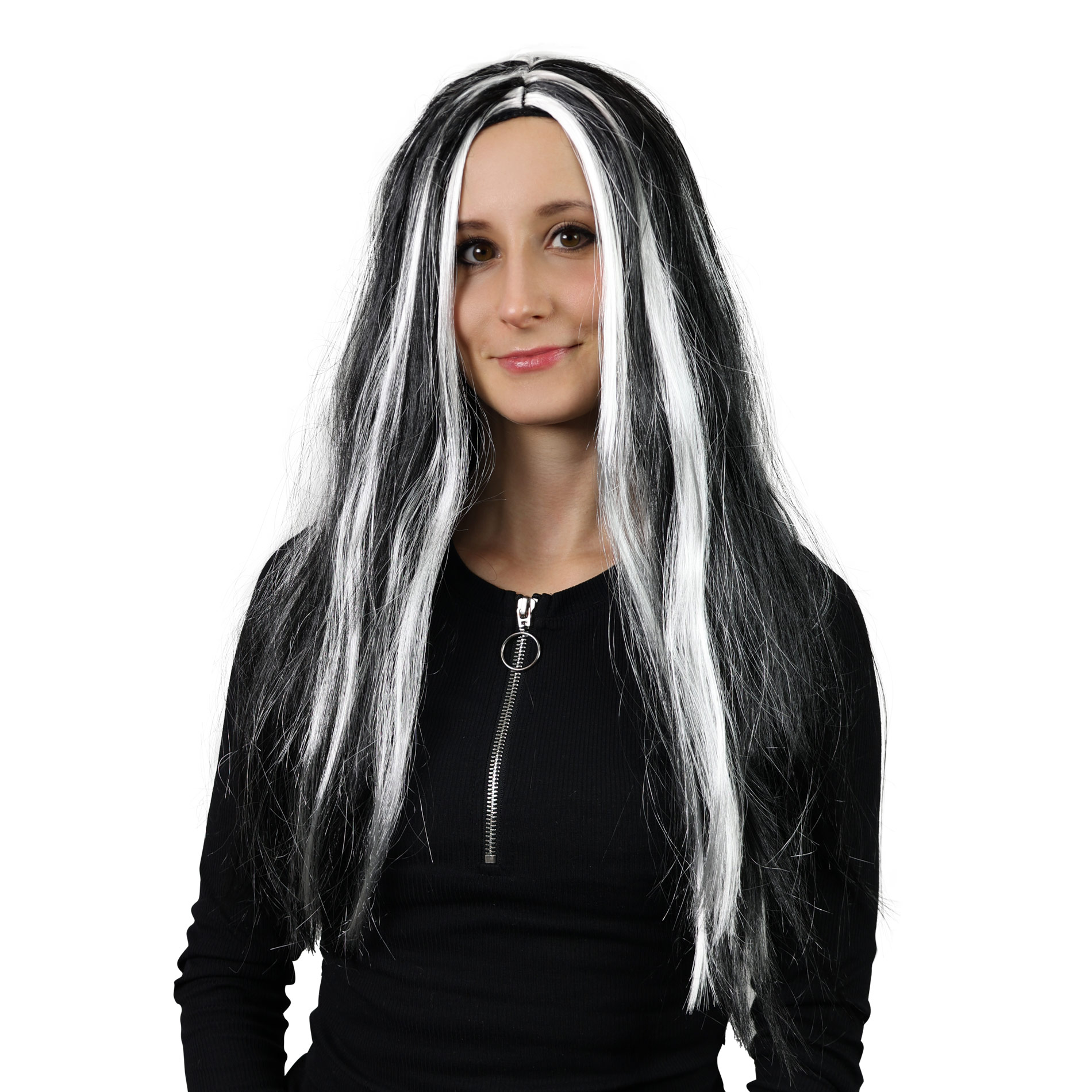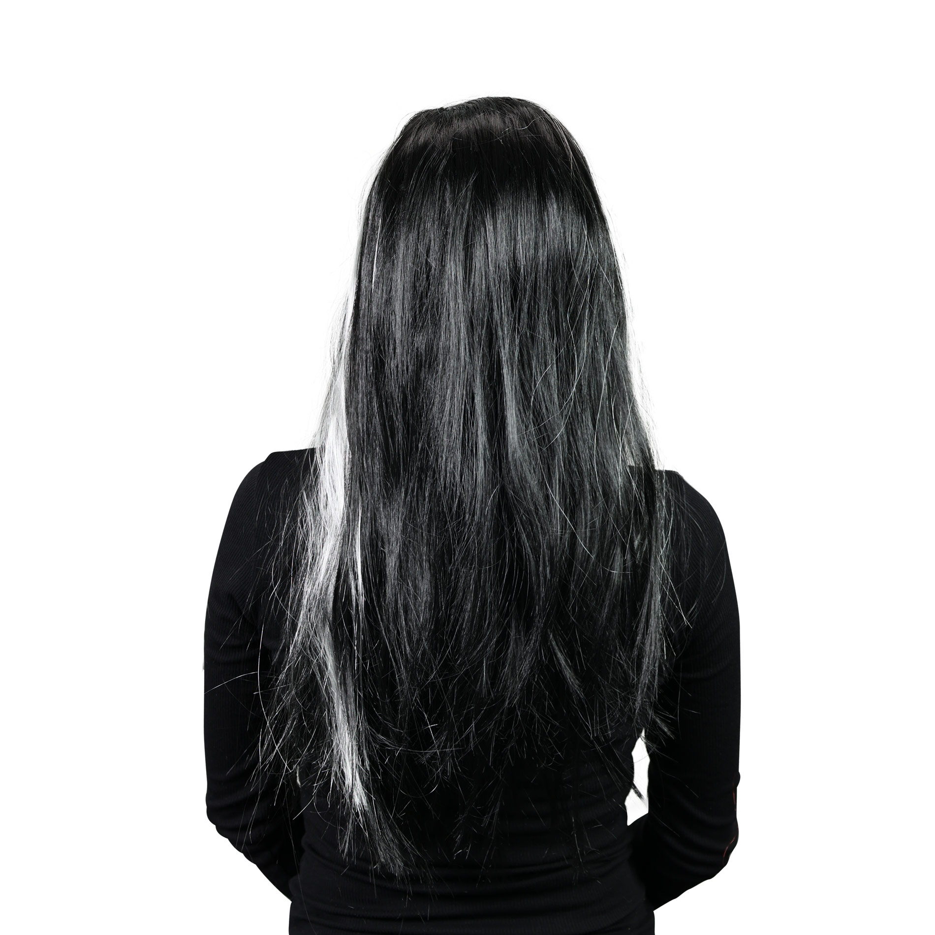 Karnevalová paruka v motivu čarodějnice. Paruka má dlouhé černé vlasy a je dekorována stříbrným melírem. Perfektní doplněk ke kostýmu! Vhodné i k oslavě Halloweenu.