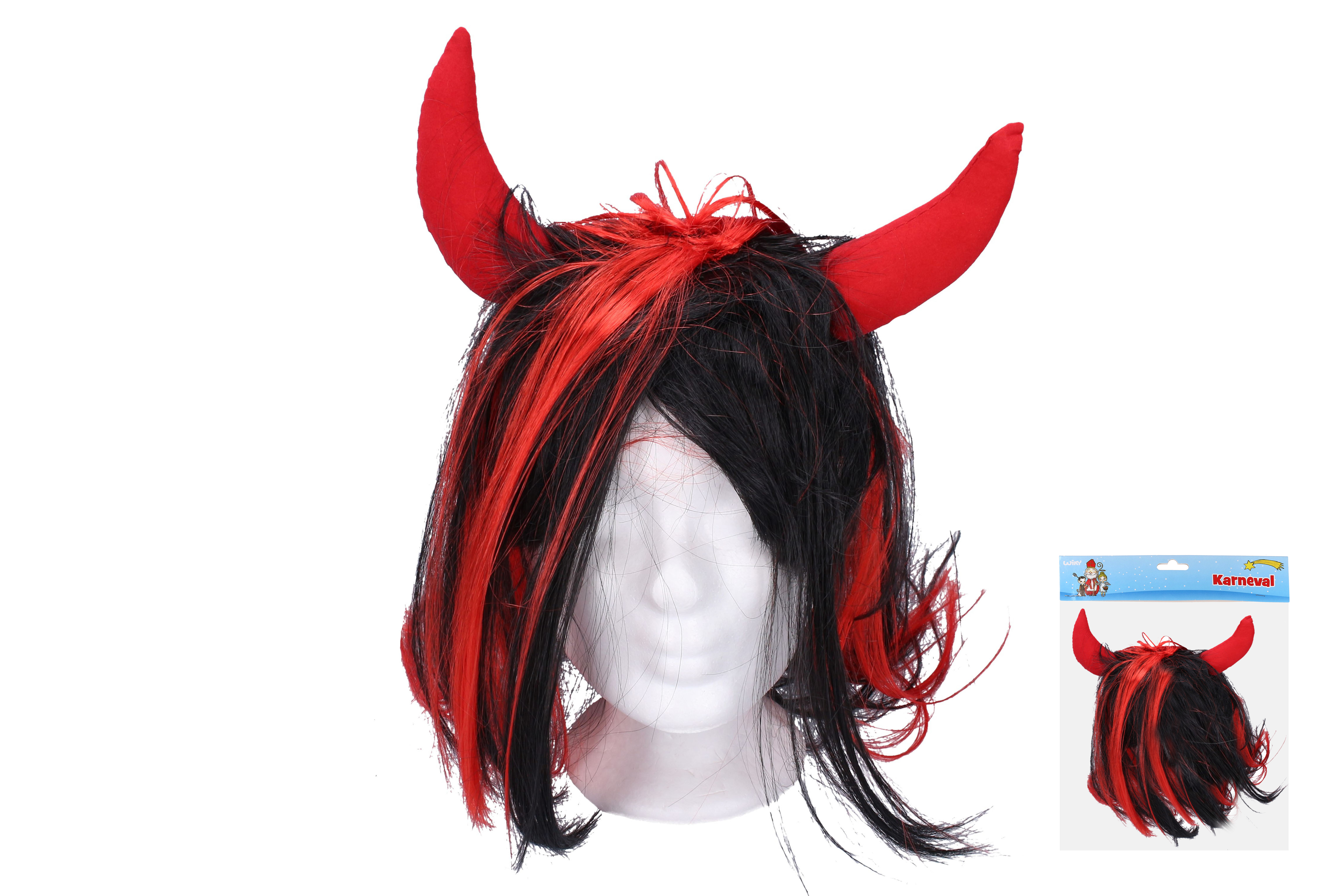 Paruku pro čerta tvoří černé vlasy s červenými prameny a s červenými textilními rohy.
