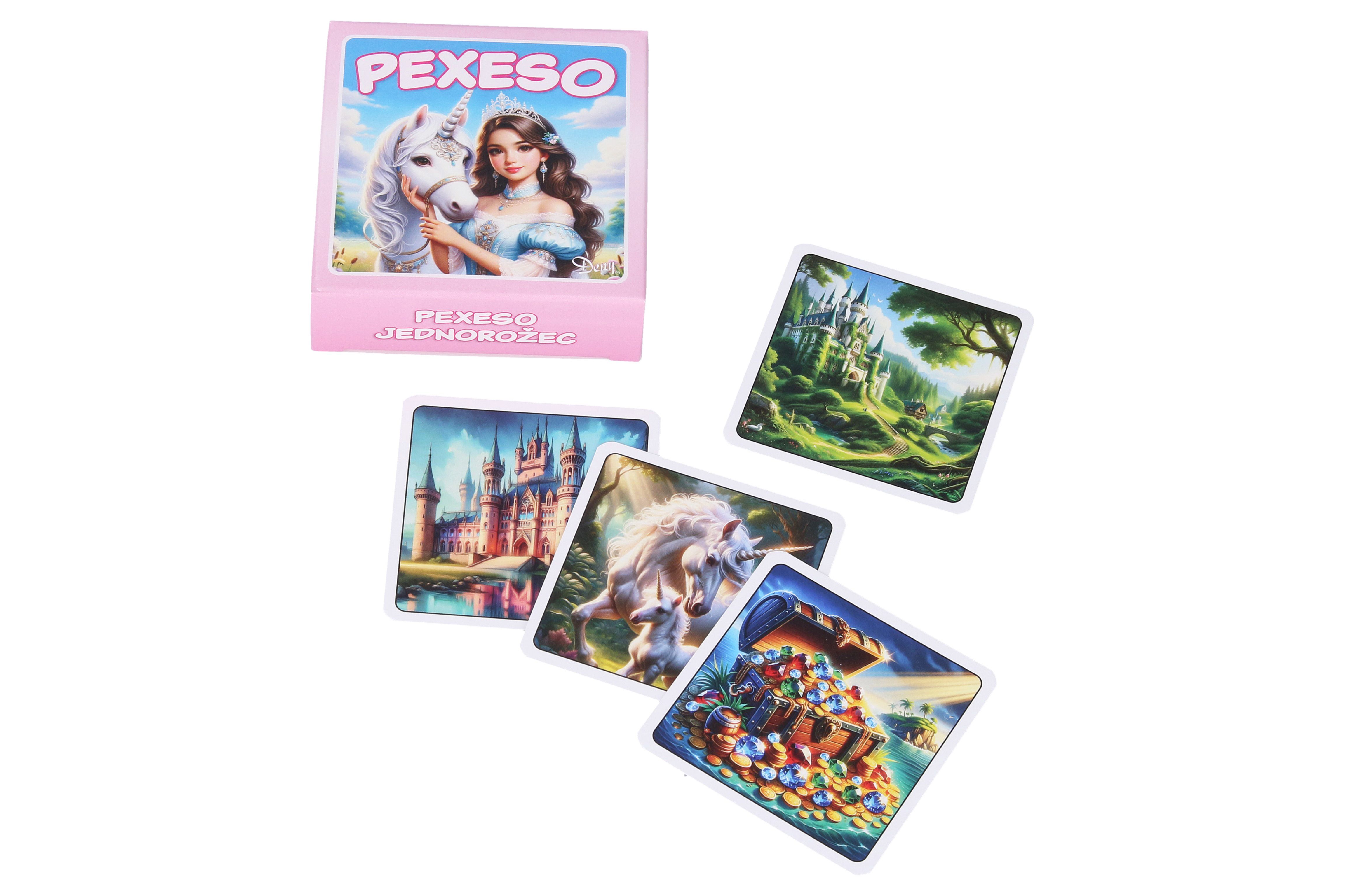 Pexeso Jednorožec v krabičce. Balení obsahuje 64 karet (32 párů) + 2 karty s pravidly. Rozměr krabičky 8x8x2,5 cm.