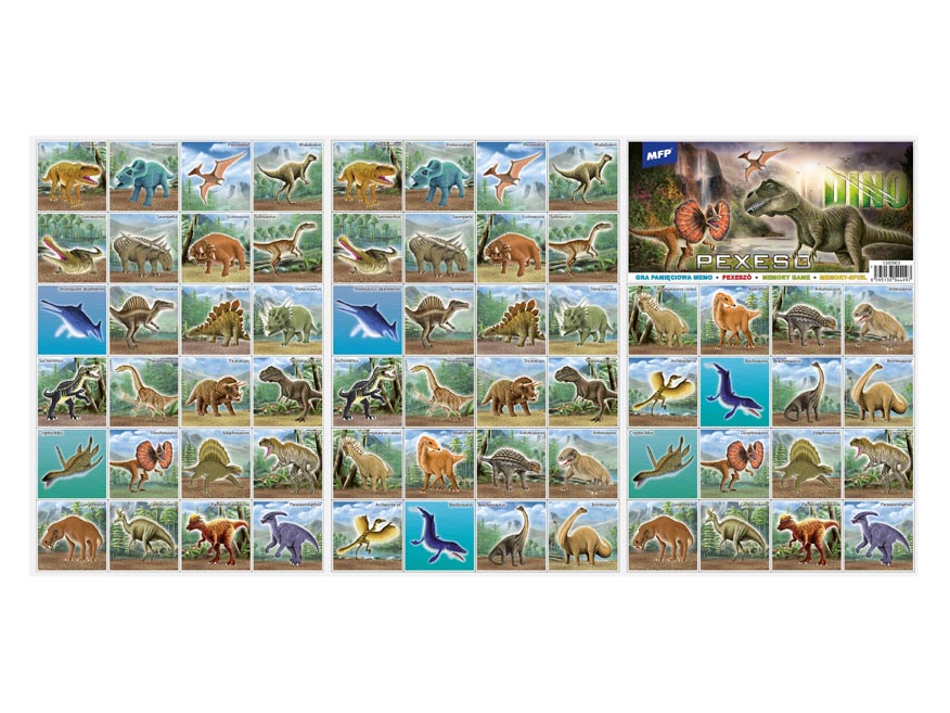 PEXESO je populární dětská stolní hra, která nikdy neomrzí a zapojit se můžou i dospělí. Pexeso - Dino - je vhodné pro chlapce a milovníky pravěku. Věděli jste, že slovo PEXESO vzniklo souslovím slov PEKELNĚ SE SOUSTŘEĎ? Výborná učební pomůcka pro děti a rodiče. Naučte své děti poznávat různé druhy dinosaurů a procvičujte jejich paměť. Tato hra je zabaví na dlouhé hodiny.Pexeso se skládá ze tří A4, na kterých najdete 64 kartiček s obrázky dinosaurů a návod ke hře.NÁVOD KE HŘE PEXESO:Pexeso mohou hrát nejméně dva hráči. Všechny rozstříhané kartičky zamíchají a rozloží obrázkem dolů do čtverce 8 x 8 kartiček. Nesmí se při tom dívat na obrázek. Hráči si určí pořadí hry. Hráč otočí dvě libovolné kartičky tak, aby si i ostatní spoluhráči mohli obrázky a jejich umístění zapamatovat. Pokud nemají kartičky stejné obrázky, otočí je a vrátí na původní místo. Pokračuje další hráč, který je na řadě. Jestliže objeví stejné obrázky, získává bod a obě kartičky vyřadí ze hry. Pokračuje do té chvíle, kdy otočí dva různé obrázky. Vyhrává hráč, který získá více bodů.PAPÍR: křída matná 350g + lamino lesk 1/1VELIKOST HRACÍCH KARET: 51x51cmVAROVÁNÍ:Nevhodné pro děti do 3 let. Nebezpečí vdechnutí a spolknutí malých částic.Uvedená cena je za 1 ks.