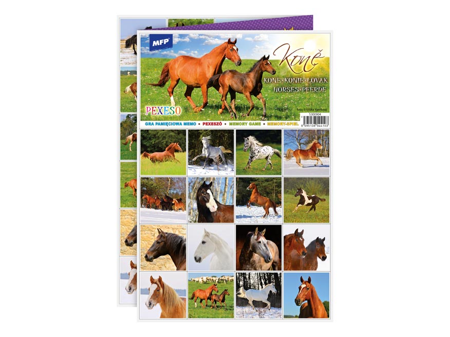 PEXESO je populární dětská stolní hra, která nikdy neomrzí a zapojit se můžou i dospělí. Pexeso - Koně - je vhodné pro milovnice a milovníky koní. Věděli jste, že slovo PEXESO vzniklo souslovím slov PEKELNĚ SE SOUSTŘEĎ? Výborná učební pomůcka pro děti a rodiče. Naučte své děti poznávat zvířata a procvičujte jejich paměť. Tato hra je zabaví na dlouhé hodiny.Pexeso se skládá ze tří A4, na kterých najdete 64 kartiček s obrázky koní a návod ke hře.NÁVOD KE HŘE PEXESO:Pexeso mohou hrát nejméně dva hráči. Všechny rozstříhané kartičky zamíchají a rozloží obrázkem dolů do čtverce 8 x 8 kartiček. Nesmí se při tom dívat na obrázek. Hráči si určí pořadí hry. Hráč otočí dvě libovolné kartičky tak, aby si i ostatní spoluhráči mohli obrázky a jejich umístění zapamatovat. Pokud nemají kartičky stejné obrázky, otočí je a vrátí na původní místo. Pokračuje další hráč, který je na řadě. Jestliže objeví stejné obrázky, získává bod a obě kartičky vyřadí ze hry. Pokračuje do té chvíle, kdy otočí dva různé obrázky. Vyhrává hráč, který získá více bodů.PAPÍR: křída matná 350g + lamino lesk 1/1VELIKOST HRACÍCH KARET: 51x51cmVAROVÁNÍ:Nevhodné pro děti do 3 let. Nebezpečí vdechnutí a spolknutí malých částic.Uvedená cena je za 1 ks.