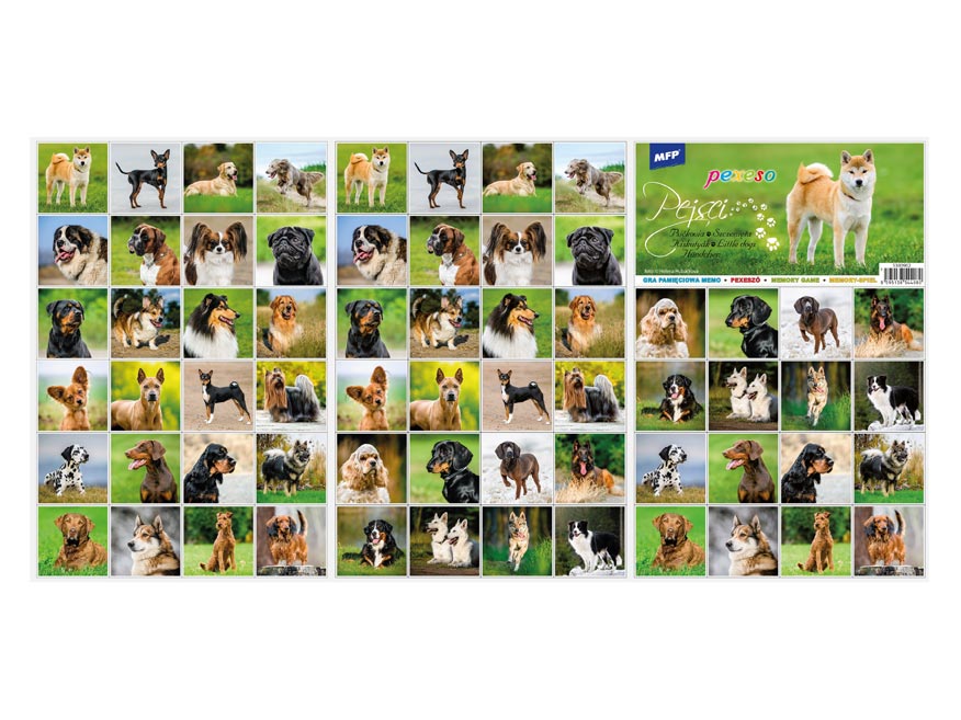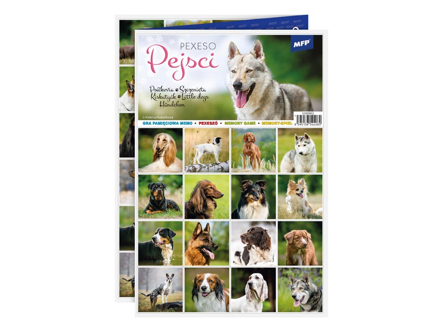 PEXESO je populární dětská stolní hra, která nikdy neomrzí a zapojit se můžou i dospělí. Pexeso - Pejsci - je vhodné pro milovníky psích mazlíčků. Věděli jste, že slovo PEXESO vzniklo souslovím slov PEKELNĚ SE SOUSTŘEĎ? Výborná učební pomůcka pro děti a rodiče. Naučte své děti poznávat psí plemena a procvičujte jejich paměť. Tato hra je zabaví na dlouhé hodiny.Pexeso se skládá ze tří A4, na kterých najdete 64 kartiček s obrázky psů a návod ke hře.NÁVOD KE HŘE PEXESO:Pexeso mohou hrát nejméně dva hráči. Všechny rozstříhané kartičky zamíchají a rozloží obrázkem dolů do čtverce 8 x 8 kartiček. Nesmí se při tom dívat na obrázek. Hráči si určí pořadí hry. Hráč otočí dvě libovolné kartičky tak, aby si i ostatní spoluhráči mohli obrázky a jejich umístění zapamatovat. Pokud nemají kartičky stejné obrázky, otočí je a vrátí na původní místo. Pokračuje další hráč, který je na řadě. Jestliže objeví stejné obrázky, získává bod a obě kartičky vyřadí ze hry. Pokračuje do té chvíle, kdy otočí dva různé obrázky. Vyhrává hráč, který získá více bodů.PAPÍR: křída matná 350g + lamino lesk 1/1VELIKOST HRACÍCH KARET: 51x51cmVAROVÁNÍ:Nevhodné pro děti do 3 let. Nebezpečí vdechnutí a spolknutí malých částic.Uvedená cena je za 1 ks.