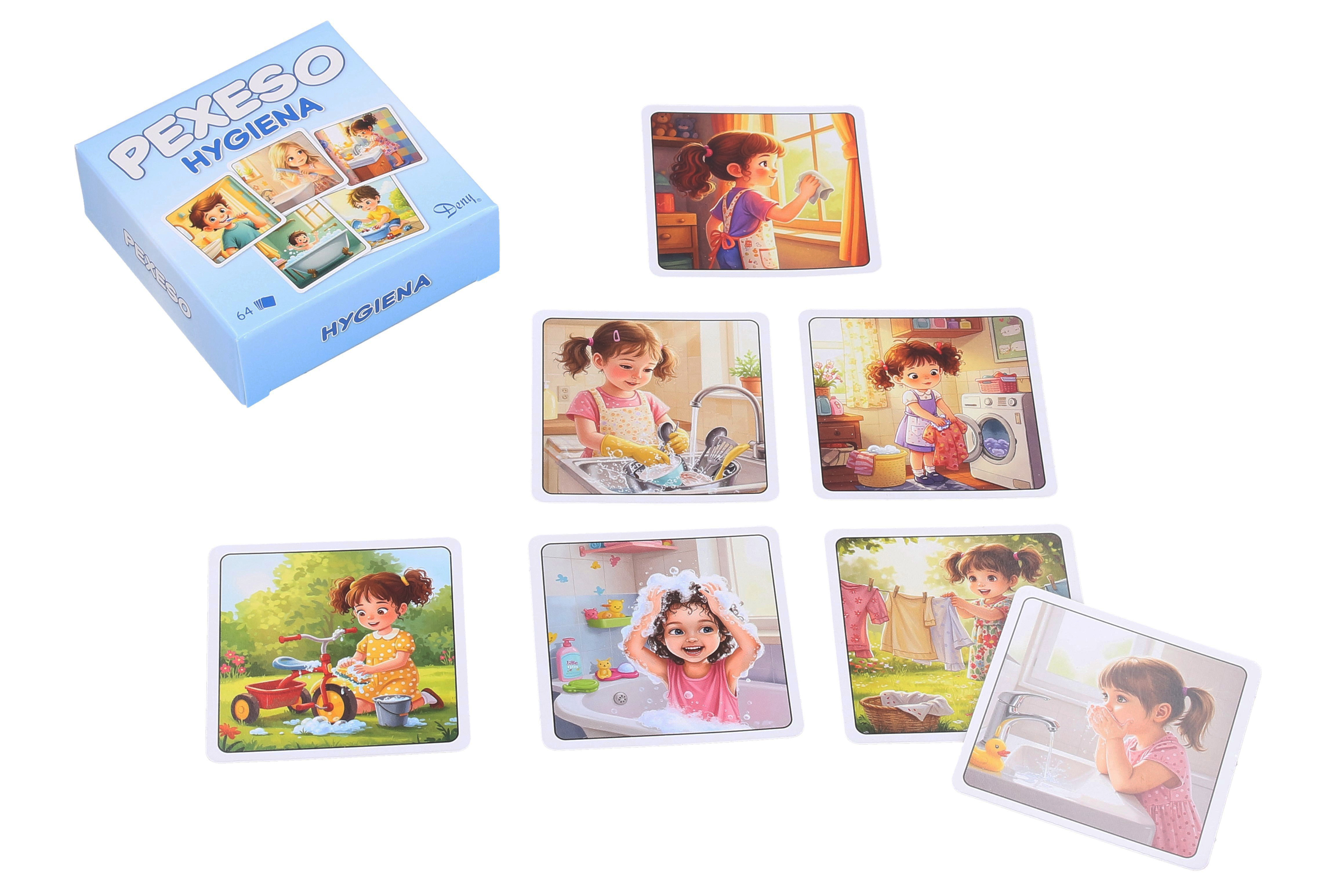 Pexeso Osobní hygiena. Balení obsahuje 64 karet (32 párů) + 2 karty s pravidly. Rozměr krabičky 8x8x2,5 cm.