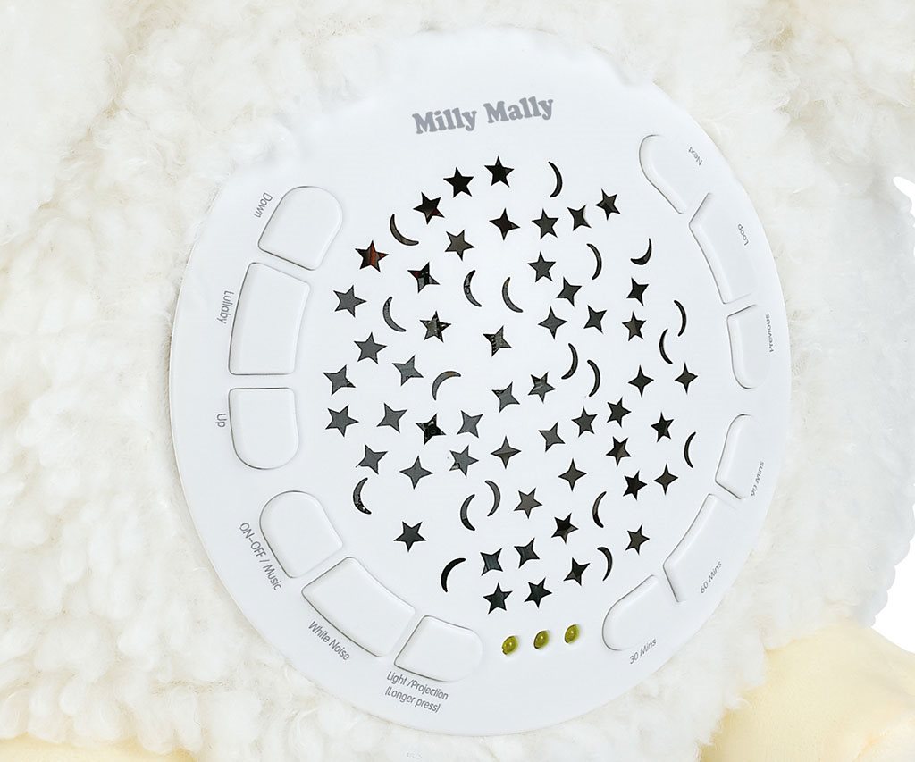 Můžete nastavit vhodnou dobu trvání: 30, 60, 90 minut. K dispozici je 5 úrovní hlasitosti. Skvělým doplňkem jeho funkce je 5 druhů bílého šumu, který má na batole obzvláště uklidňující účinek umožňující mu zklidnit se a rychleji usnout. S touto hračkou uslyšíte jemné zvuky: zurčení vody se zvuky ptáků, tlukot srdce, kapání vody, zpěv ptáků nebo padající déšť.