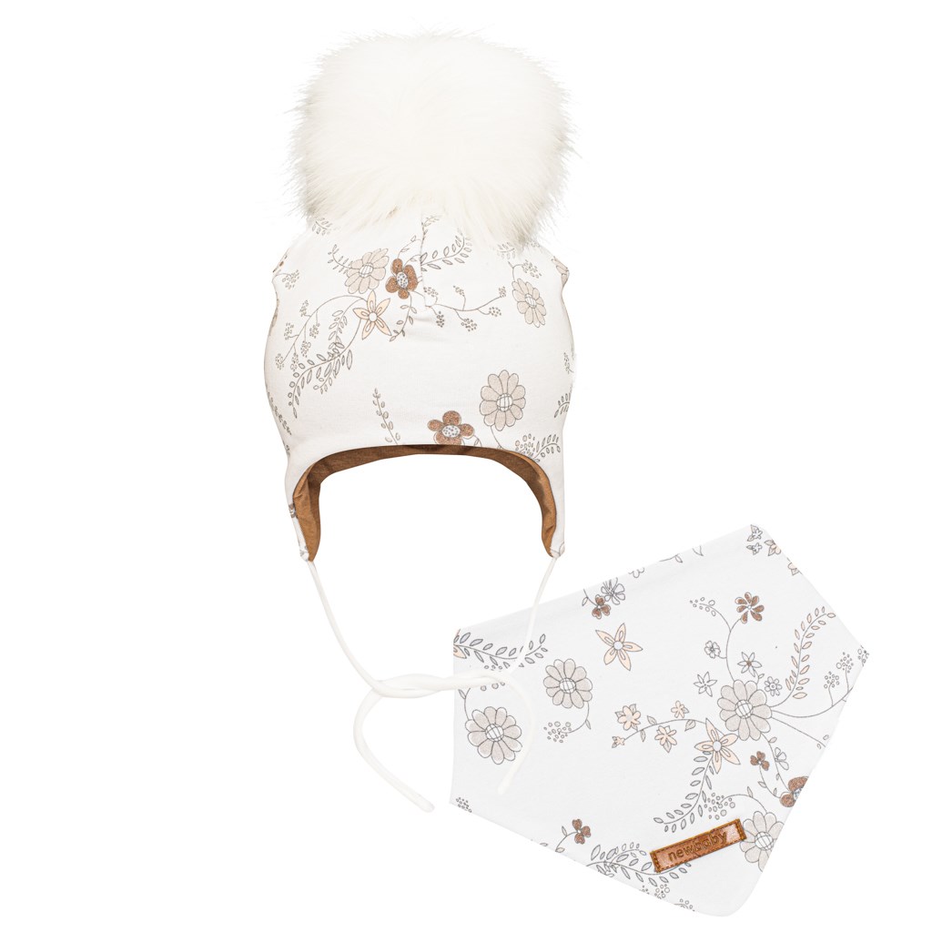 Podzimní 2-dílný set české značky New Baby Special One. Set se skládá z čepičky a šátku na krk. Čepička s podšívkou je krásně tvarovaná na ouška, zavazuje se na tkaničky a dobře drží na hlavičce miminka. Je zdobena krásnou bambulkou a celý set je vyroben z příjemné na dotek látky, která je potištěná kytičkami. Šátek na krk lze zapnout do 2 velikostí. Kvalitní a velmi praktický doplněk do chladného počasí. Pro New Baby je velmi důležitá spokojenost zákazníka a právě proto vám nabízíme set z kolekce New Baby Special One. Vrchní materiál: 95% bavlna, 5% elastan. Podšívka: 95%bavlna, 5% elastan. Vhodné na zimu i podzim.