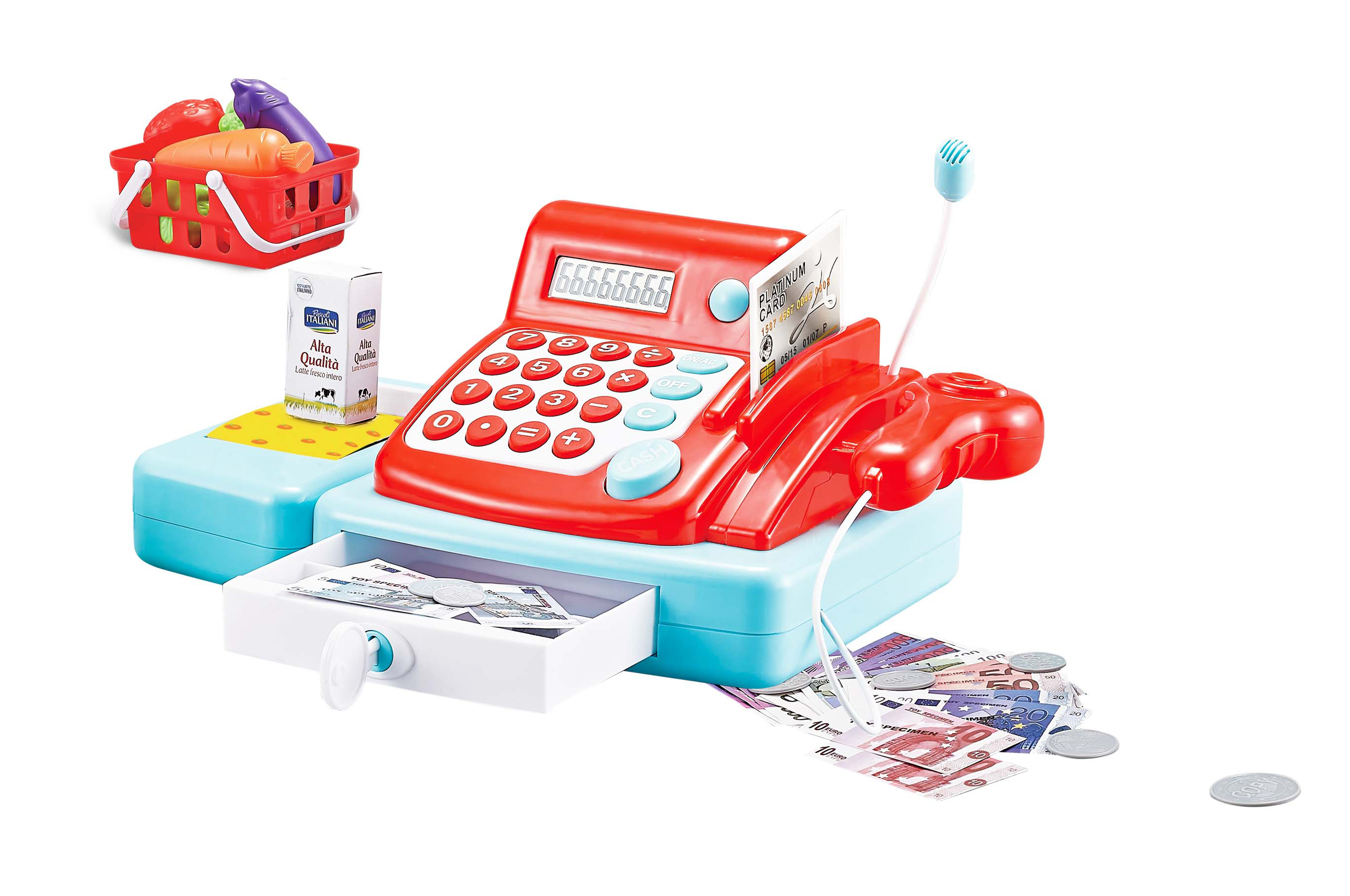 Pokladna s doplňky s efekty. velikost 33x19x14cm. 2xAA baterie nejsou součástí. Obsahuje pokladnu, košík s potravinami, peníze.