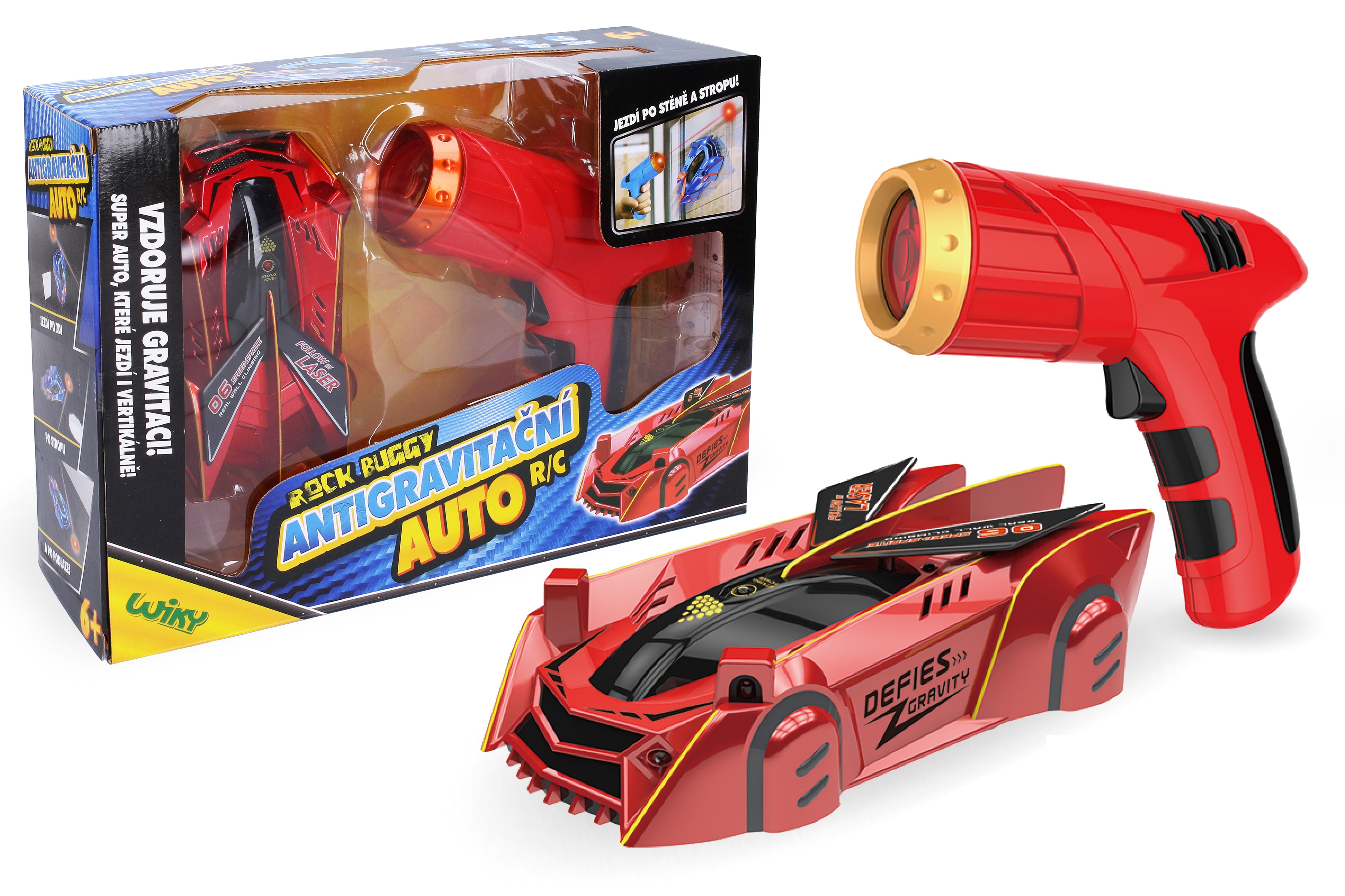 Autíčko pronásleduje laser a dokáže jezdit po stěnách i po stropě. USB nabíjecí kabel v balení.