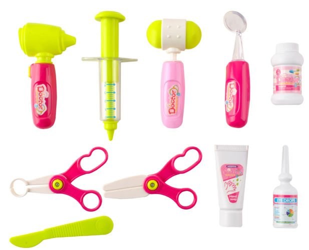 18 dílů: stetoskop, otoskop, pulzometr, teploměr, zubní zrcátko, neurologické kladívko, injekce, nůžky, pinzeta, oční kapky, mýdlo v tubě, miska, skalpel, brýle bez skel, lahvička, jmenovka, plastový zápisník, infuze