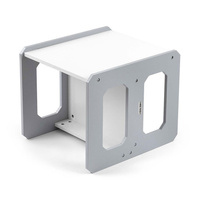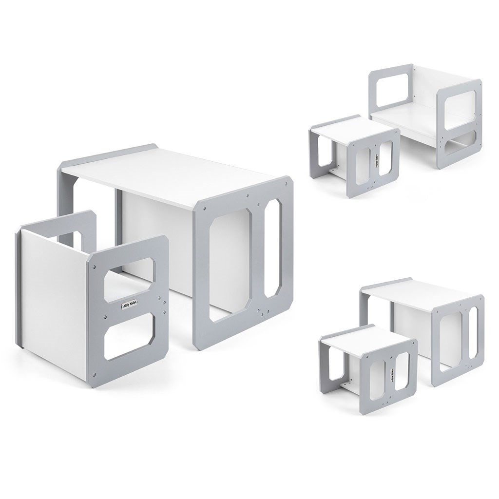 Sada se skládá z jednoho stolku a jedné židličky, které díky modulární konstrukci mohou plnit různé funkce – stolek lze proměnit ve větší sedadlo a židlička se dokonale hodí jako menší stolek nebo sedátko bez opěradla pro starší dítě. Díky své lehké konstrukci je tento nábytek snadno přenosný, což umožňuje dětem přizpůsobit si ho podle svých potřeb.