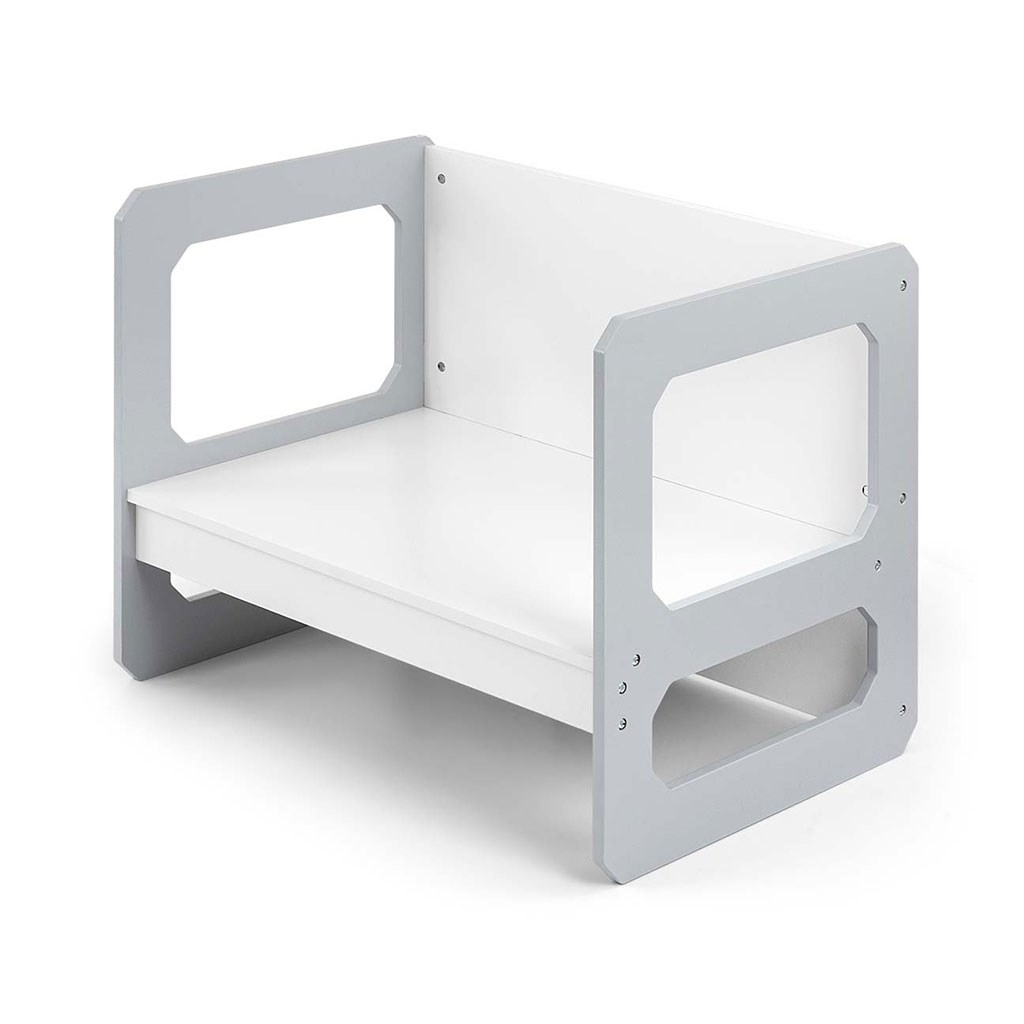 Sada nábytku 3v1 Stella v barevné kombinaci bílé a šedé se šedými doplňky, navržená s ohledem na zajištění dětem: pohodlí, prostoru pro kreativní hraní, malování, psaní a maximálního komfortu během činností.