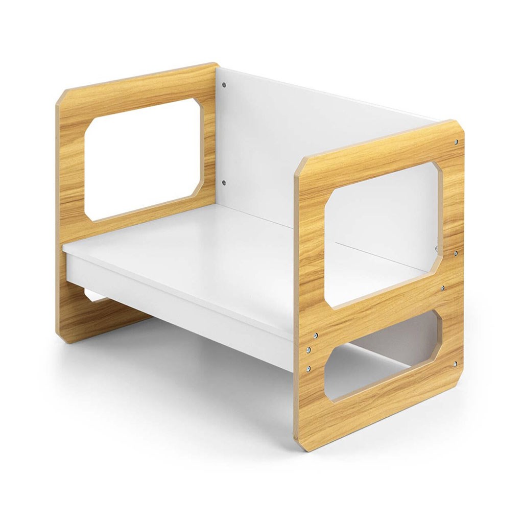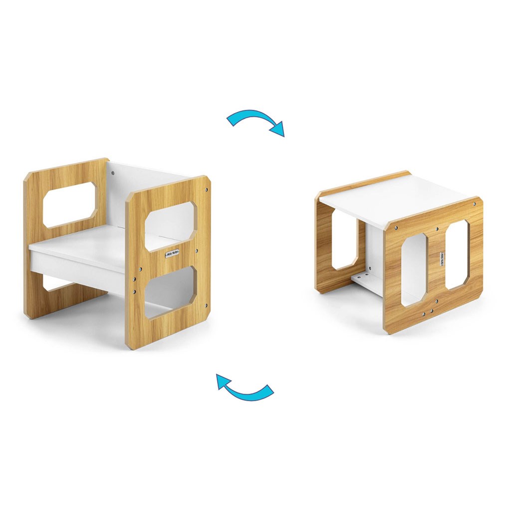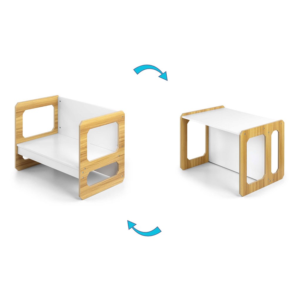 Sada se skládá z jednoho stolku a jedné židličky, které díky modulární konstrukci mohou plnit různé funkce – stolek lze proměnit ve větší sedadlo a židlička se dokonale hodí jako menší stolek nebo sedátko bez opěradla pro starší dítě. Díky své lehké konstrukci je tento nábytek snadno přenosný, což umožňuje dětem přizpůsobit si ho podle svých potřeb.