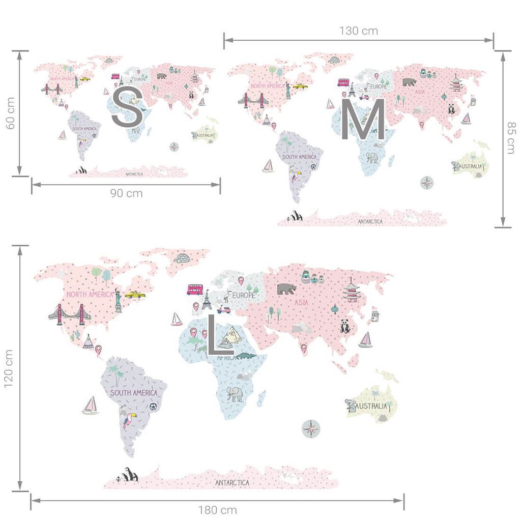 kontinenty, ostrovy a doplňkové (vzdělávací) prvky M (130x85 cm). Přesné rozměry každé části nálepky jsou uvedeny na poslední fotografii. Upozornění: Nedoporučujeme aplikovat naše samolepky na stěny natřené latexovými, hladkými nebo voskovými barvami. Baleno v eko tubách.