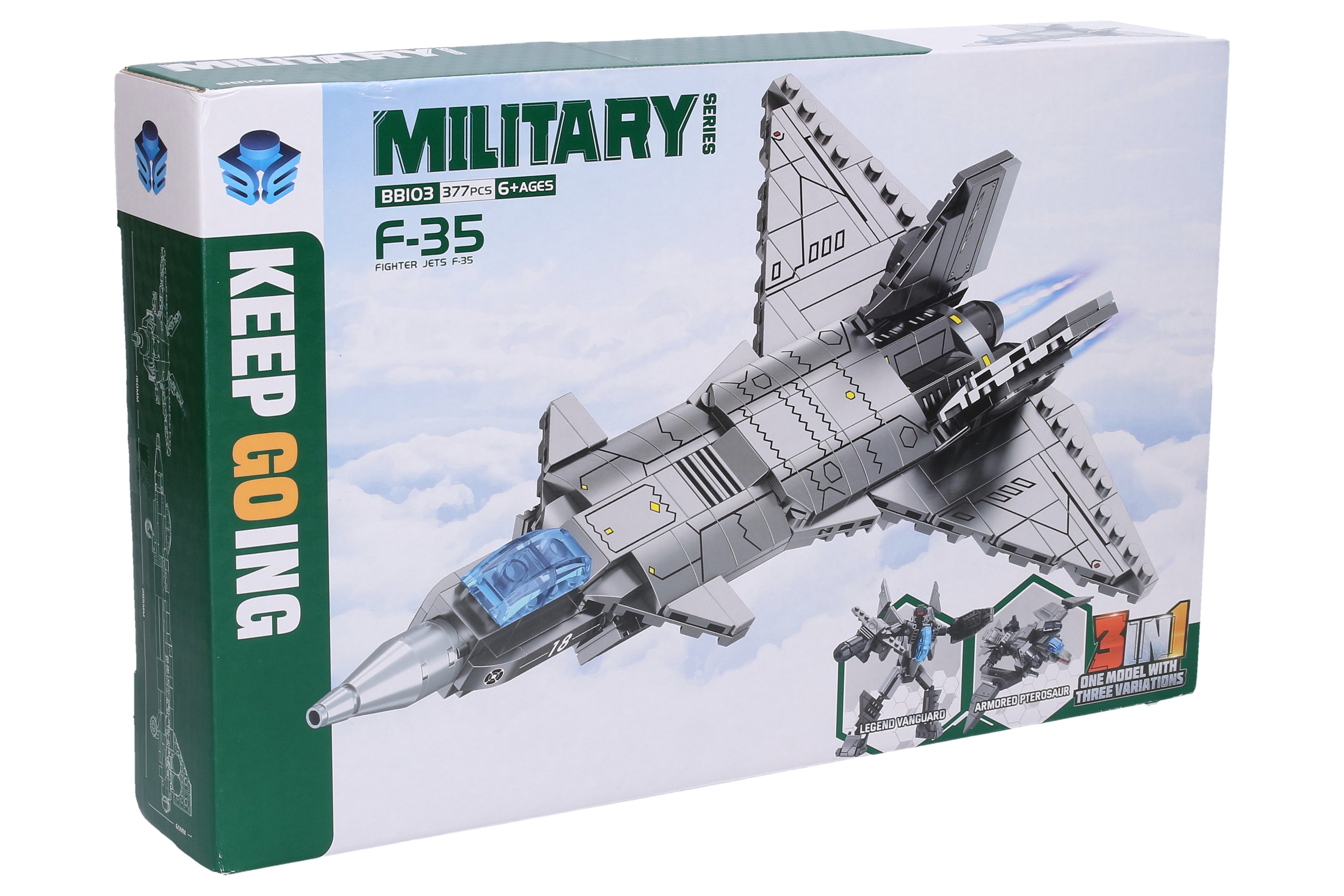 Stíhačka stavebnice 3v1. Velikost stíhačky 28cm. Ze stavebnice lze složit stíhačku, robota, ozbrojeného pteosaura. Obsahuje 377dílků.