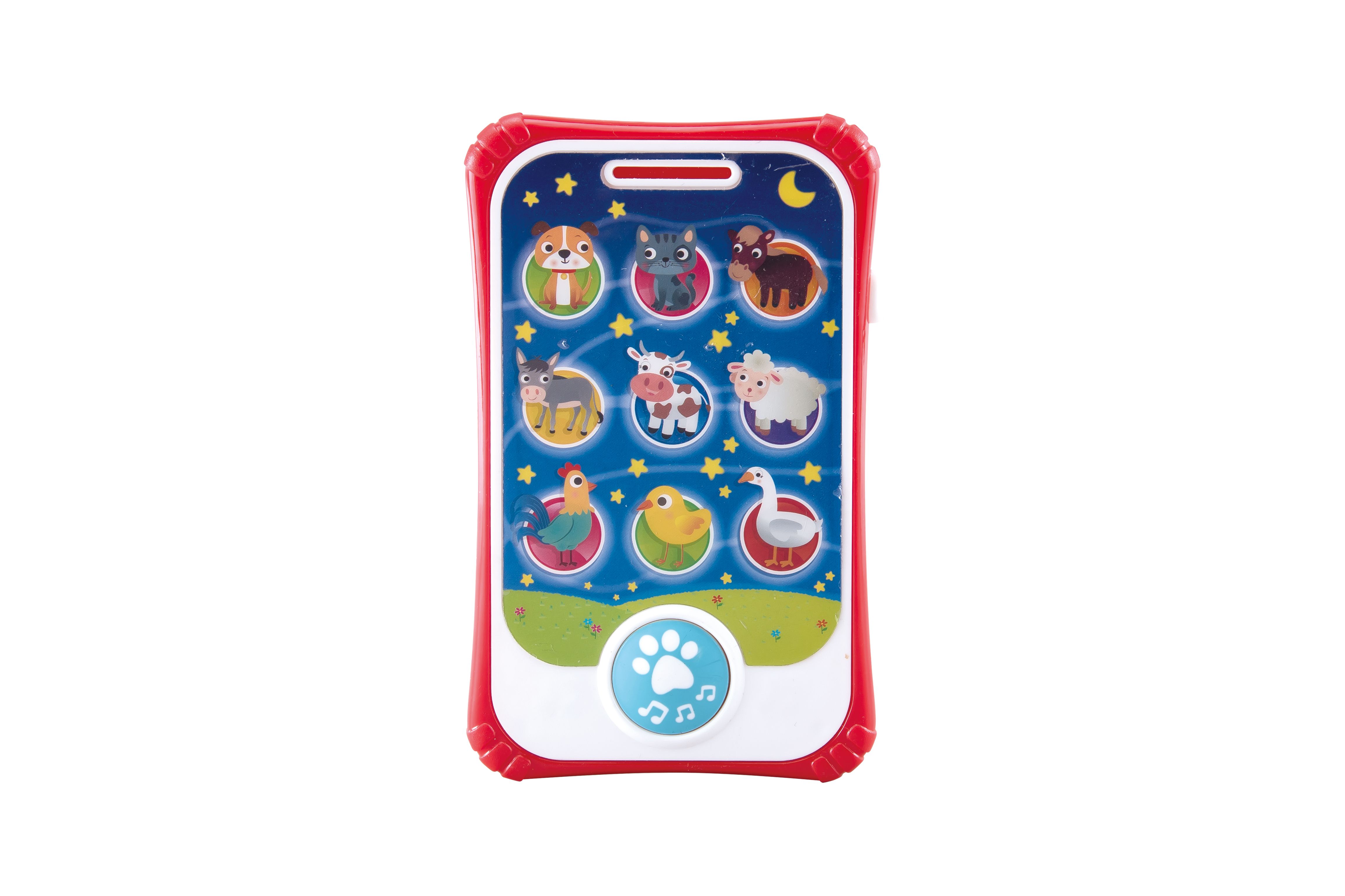 Telefon smartphone zvířátka. Velikost 15cm. Velkým tlačítkem se mění zvuky, které vydávají tlačítka se zvířátky. Zvuky zvířátek, melodie a jiné zvuky. světelné efekty. tlačítko on/off. Baterie 2xAAA součástí.
