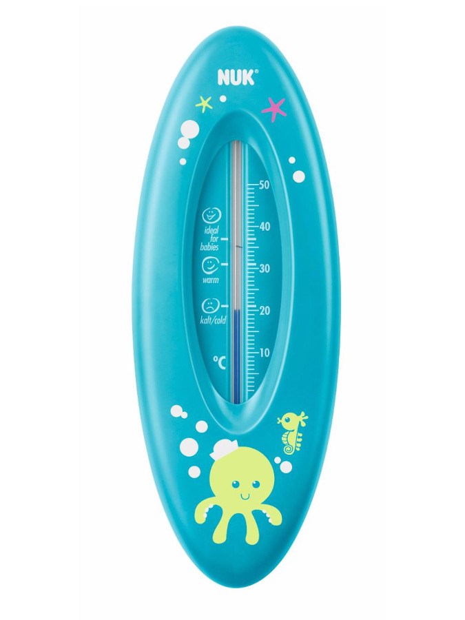 Barevný plovoucí teploměr NUK do vaničky. Ideální teplota pro Vaše dítě je označená na teploměru a je 36,9°C (dávejte pozor, aby teplota nepřesáhla 37°C), teplota vzduchu během koupání by měla být kolem 20°C – 22°C. Díky ukazatelům Cold, Warm a Ideal for babies lze ideálně přizpůsobit teplotu vody potřebám miminka. Vyroben z kvalitních a bezpečných materiálů. Zřetelné vyznačení teploty. Náplň tvoří neškodný řepkový olej.