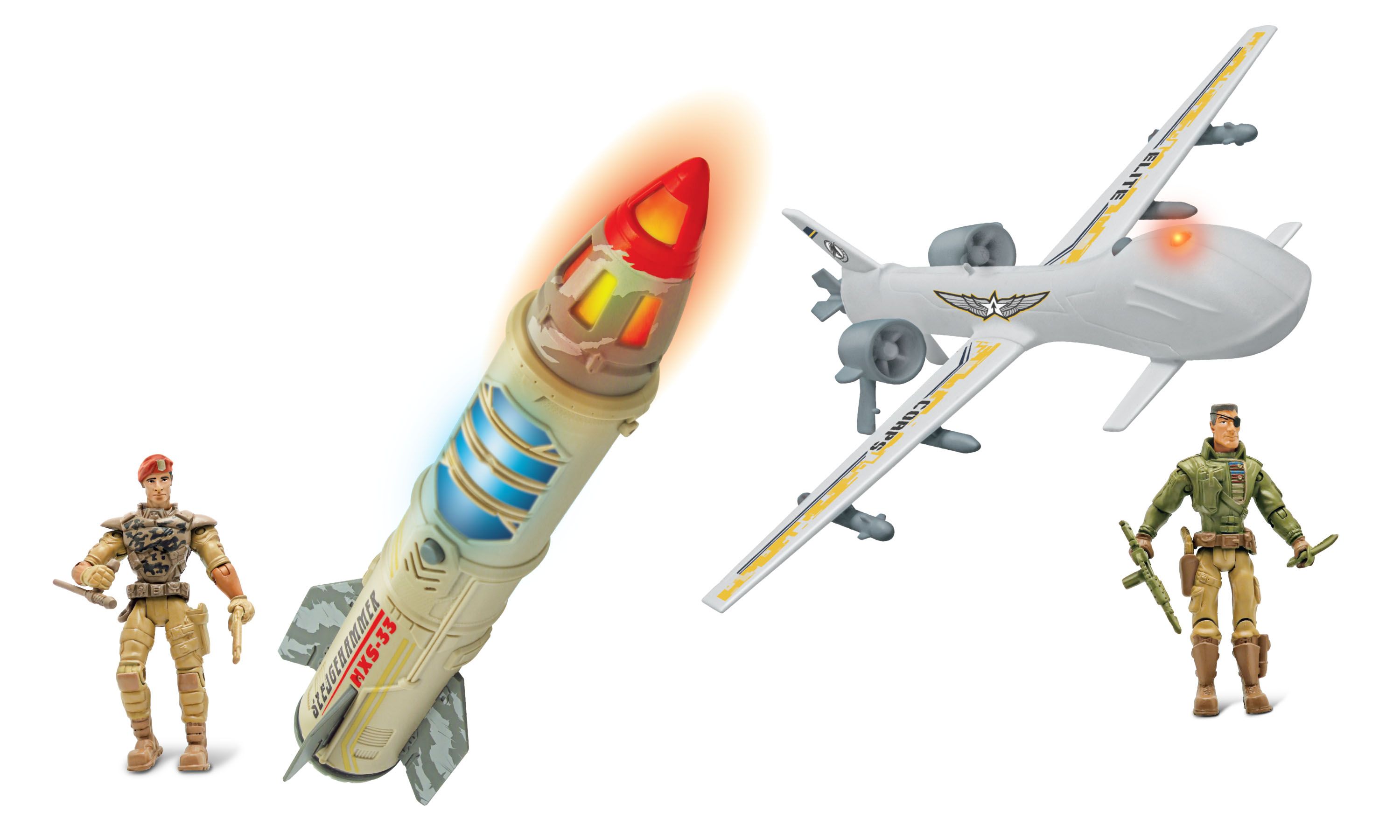 The Corps Vojenský set s figurkou a efekty. Velikost figurky 10 cm. Světelné a zvukové efekty rakety a dronu. 3xAG13 baterie součástí. 2 varianty - raketa, dron.