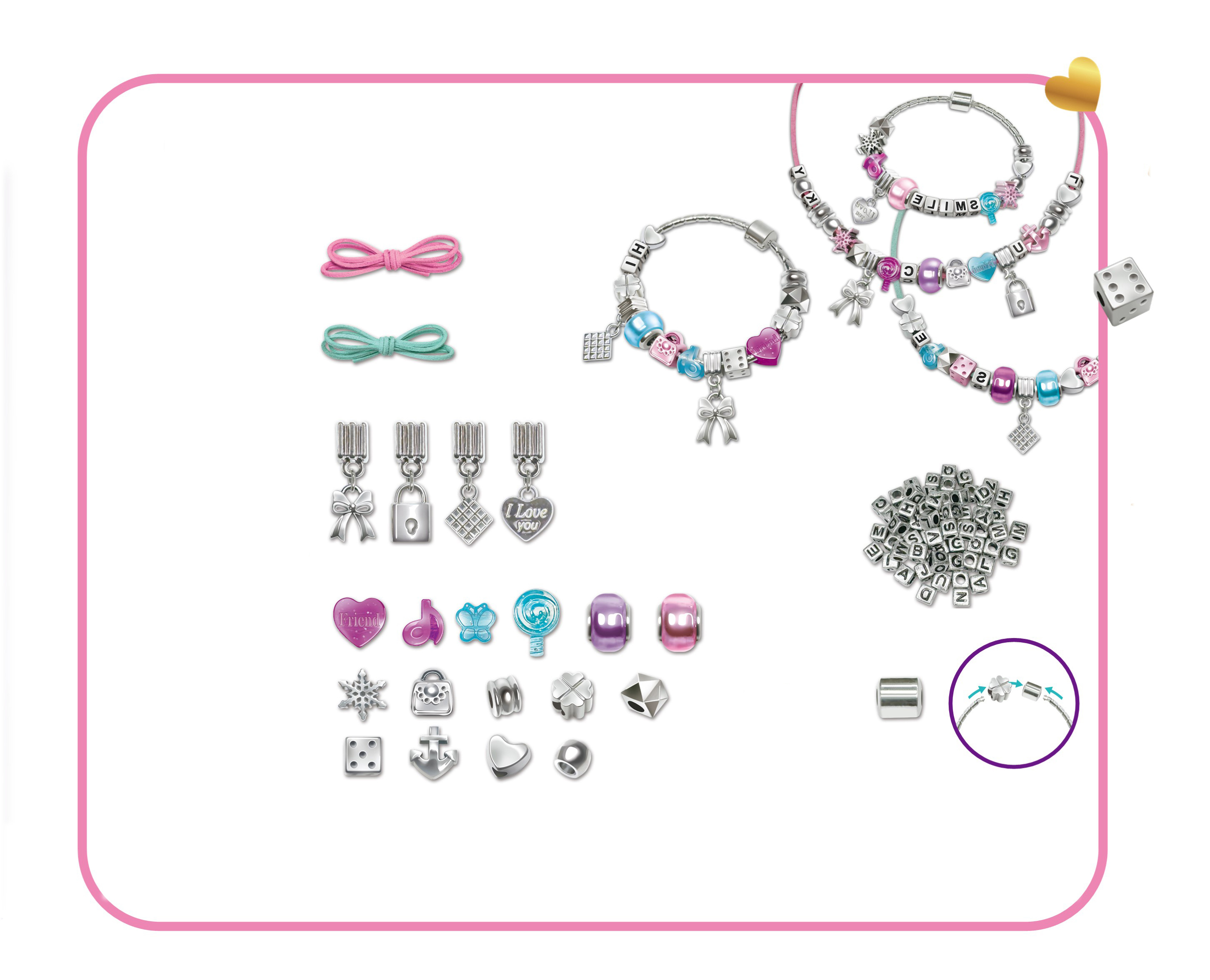 Tvorba náramků a náhrdelníků. Obsahuje 2 náramky, 2 provázky na výrobu náhrdelníku, korálky a přívěšky.