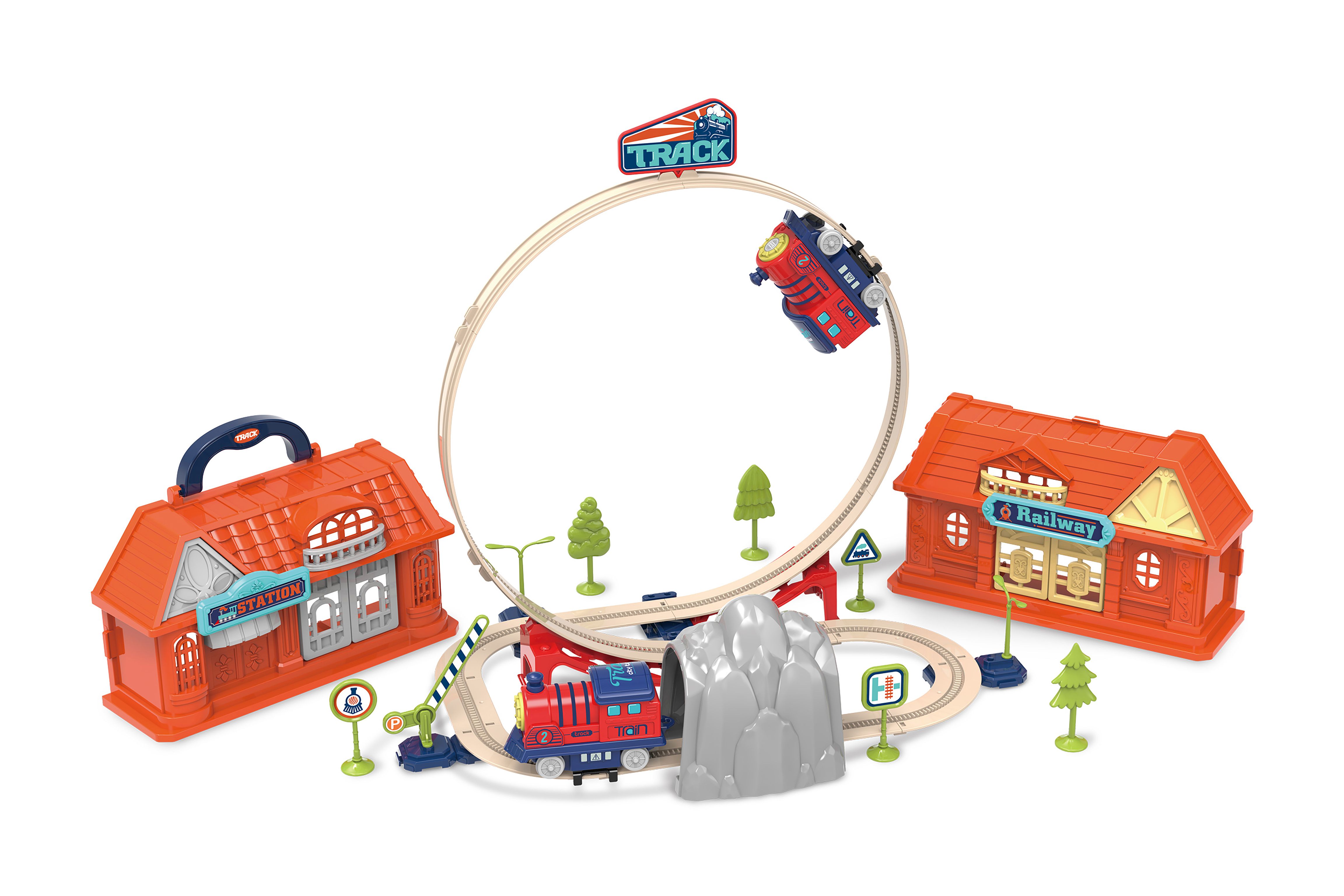 Vlaková dráha v kufříku 142 dílků. Rozměry 110x46x36,5 cm. 2xAAA baterie do mašinky nejsou součástí. Komínek mašinky slouží jako tlačítko ON/OFF. Obsah - dráha, mašinka, 2 budovy, zastávka, most, závora, značka, stromy, světla. Obrázkový návod na sestavení na vnitřní straně obalové karty.