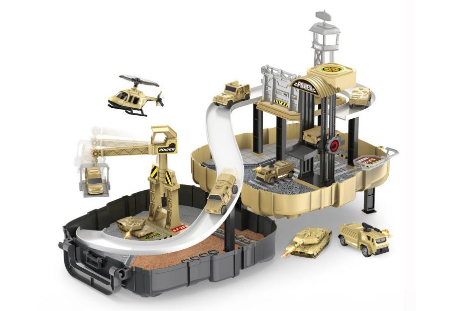 Vojenská stanice se 2 auty v batohu. Stanice obsahuje dráhu, výtah, jeřáb, heliport, 2 auta. Batoh obsahuje popruhy. Obrázkový návod na sestavení na zadní straně obalu.