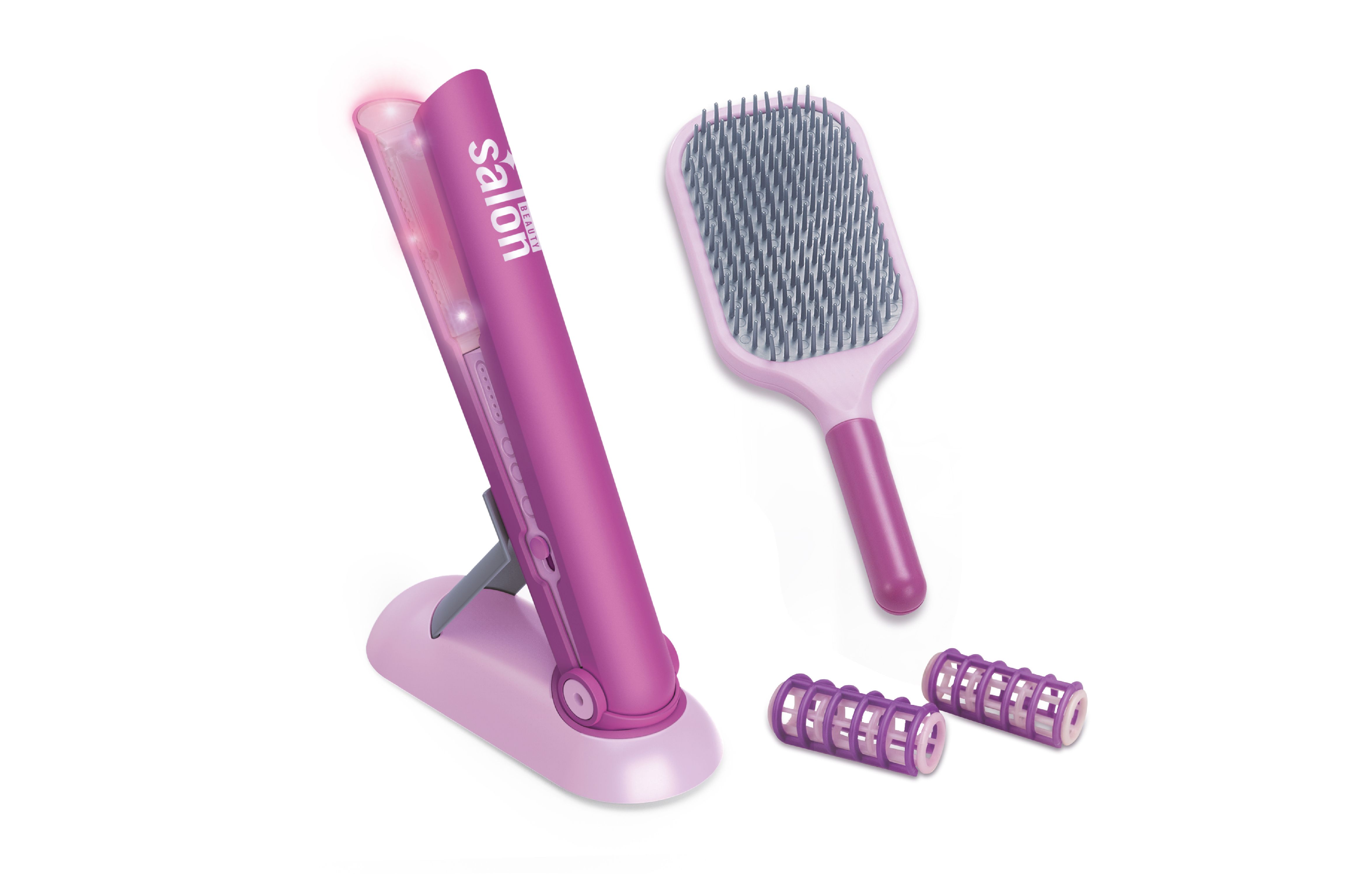 Žehlička na vlasy. Velikost žehličky 19cm. Obsahuje: kulmu, kartáč na vlasy, natáčky, stojánek na kulmu. Zvukové a světlené efekty. 2xAAA baterie nejsou součástí.